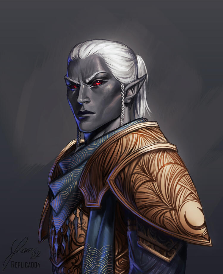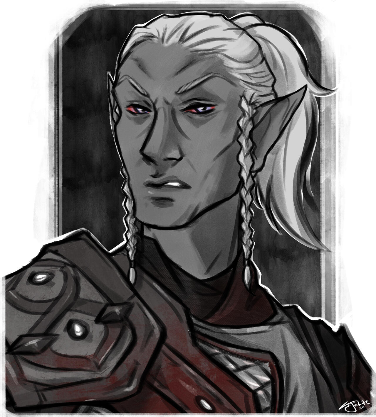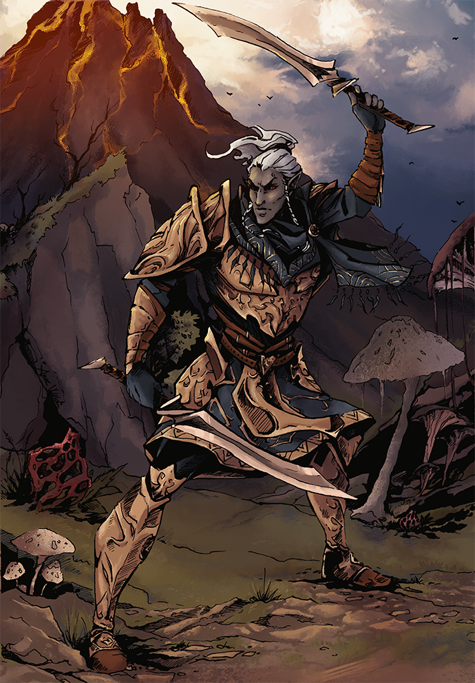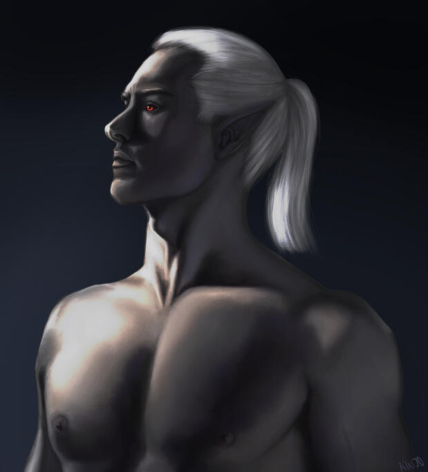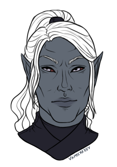 Orillion is a mer born of strong stock. With broad shoulders, strong legs, and a physique able to carry out the ardorous tasks of his profession, Orillion is built like a soldier. Not without the hallmarks of his people, Orillion’s dark-ashen skin is in stark contrast to his brilliant silver-white hair. With fiery ruby tinted eyes, Orillion’s expression is most often dour and serious, though he is not one to refrain from a heartfelt laugh when the time calls. Preferring to keep himself neat and professional, Orillion keeps his cheeks clean shaven and his hair pulled back into a tight ponytail to keep away from his face.Primarily dressed in leathers, Orillion often wears the armor of the House of which he is employed. Preferring the colors of red and black, Orillion will dye the armor provided to him to match his preferred aesthetic. In leisure he wears clothing suitable for the climate of Morrowind, favoring dark tunics and tall leather boots.