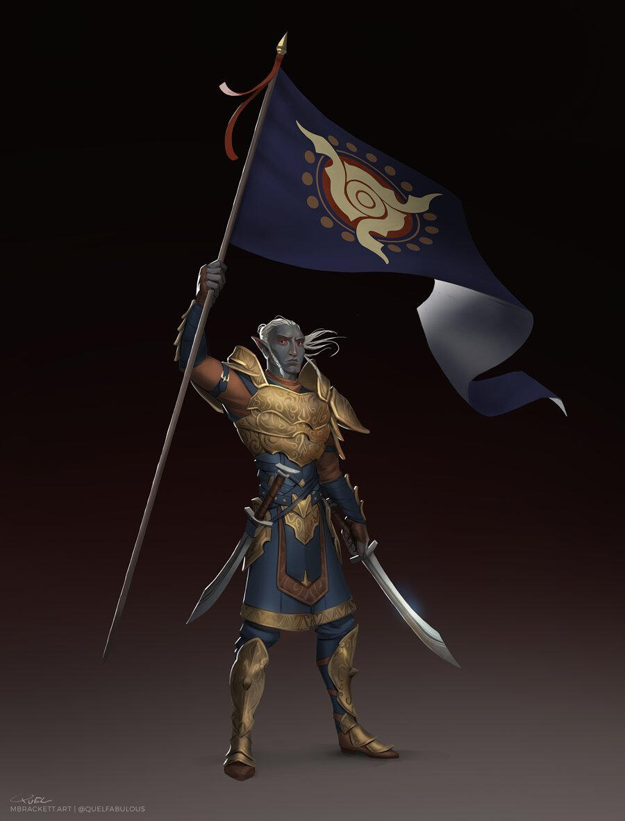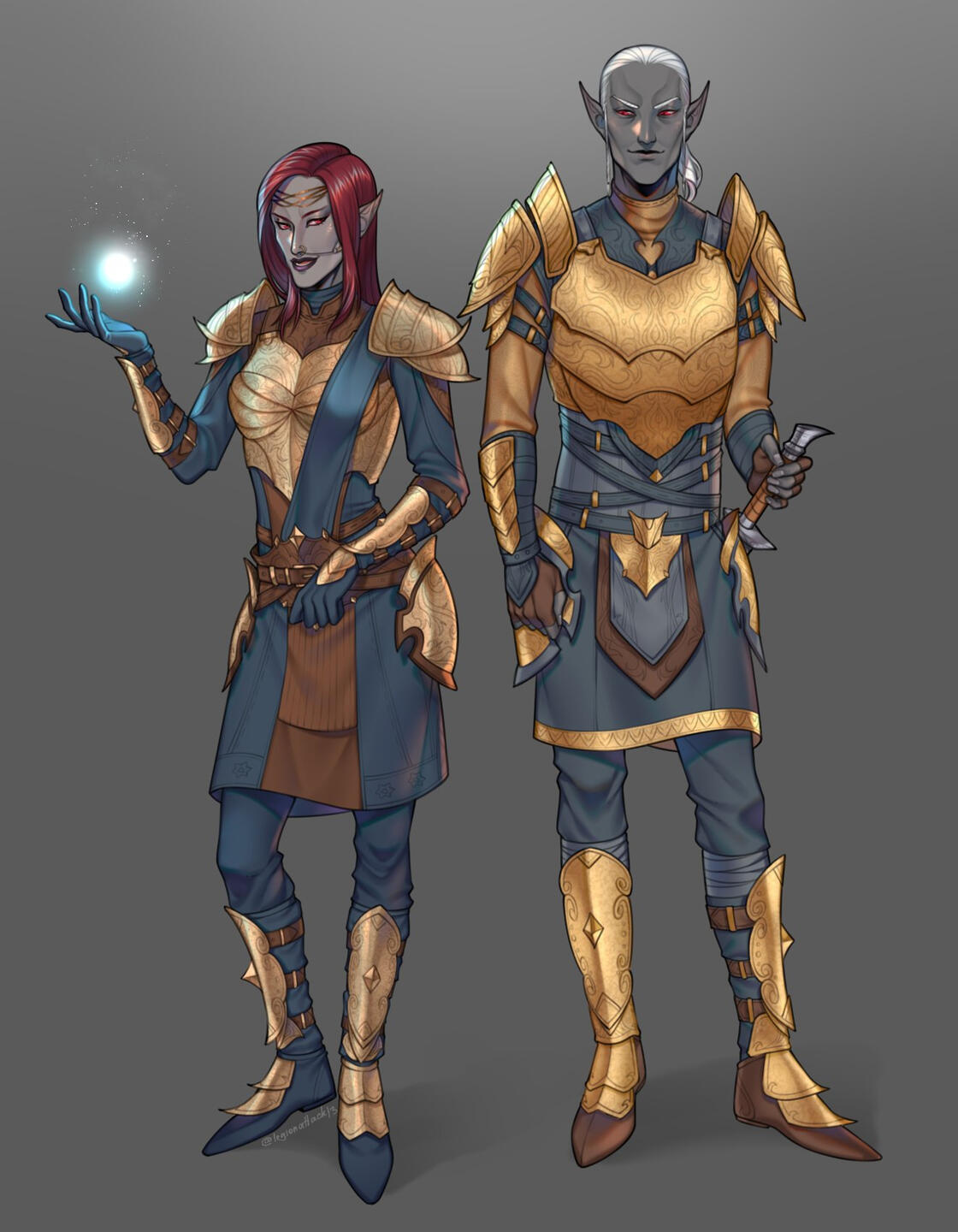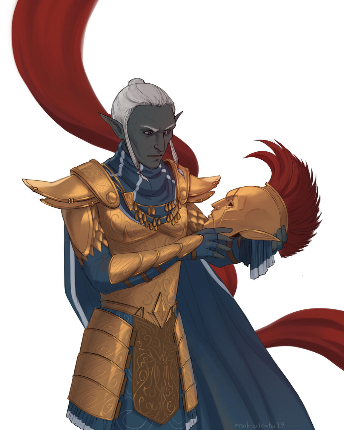 Orillion is a mer born of strong stock. With broad shoulders, strong legs, and a physique able to carry out the ardorous tasks of his profession, Orillion is built like a soldier. Not without the hallmarks of his people, Orillion’s dark-ashen skin is in stark contrast to his brilliant silver-white hair. With fiery ruby tinted eyes, Orillion’s expression is most often dour and serious, though he is not one to refrain from a heartfelt laugh when the time calls. Preferring to keep himself neat and professional, Orillion keeps his cheeks clean shaven and his hair pulled back into a tight ponytail to keep away from his face.Primarily dressed in leathers, Orillion often wears the armor of the House of which he is employed. Preferring the colors of red and black, Orillion will dye the armor provided to him to match his preferred aesthetic. In leisure he wears clothing suitable for the climate of Morrowind, favoring dark tunics and tall leather boots.